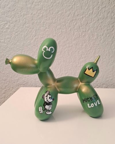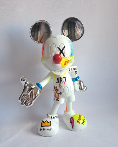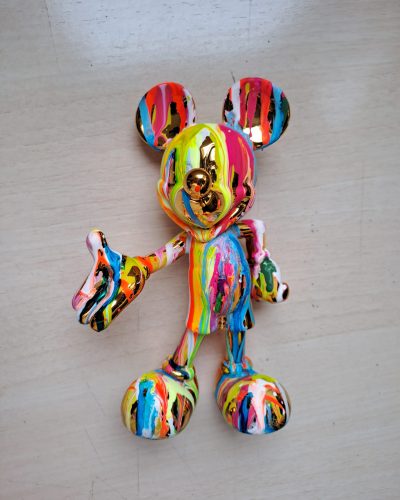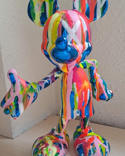 Escultura de Mickey Mouse en resina efecto Candy Blue 20cm de alto, pintada a mano con pinturas metalizadas y barniz.
