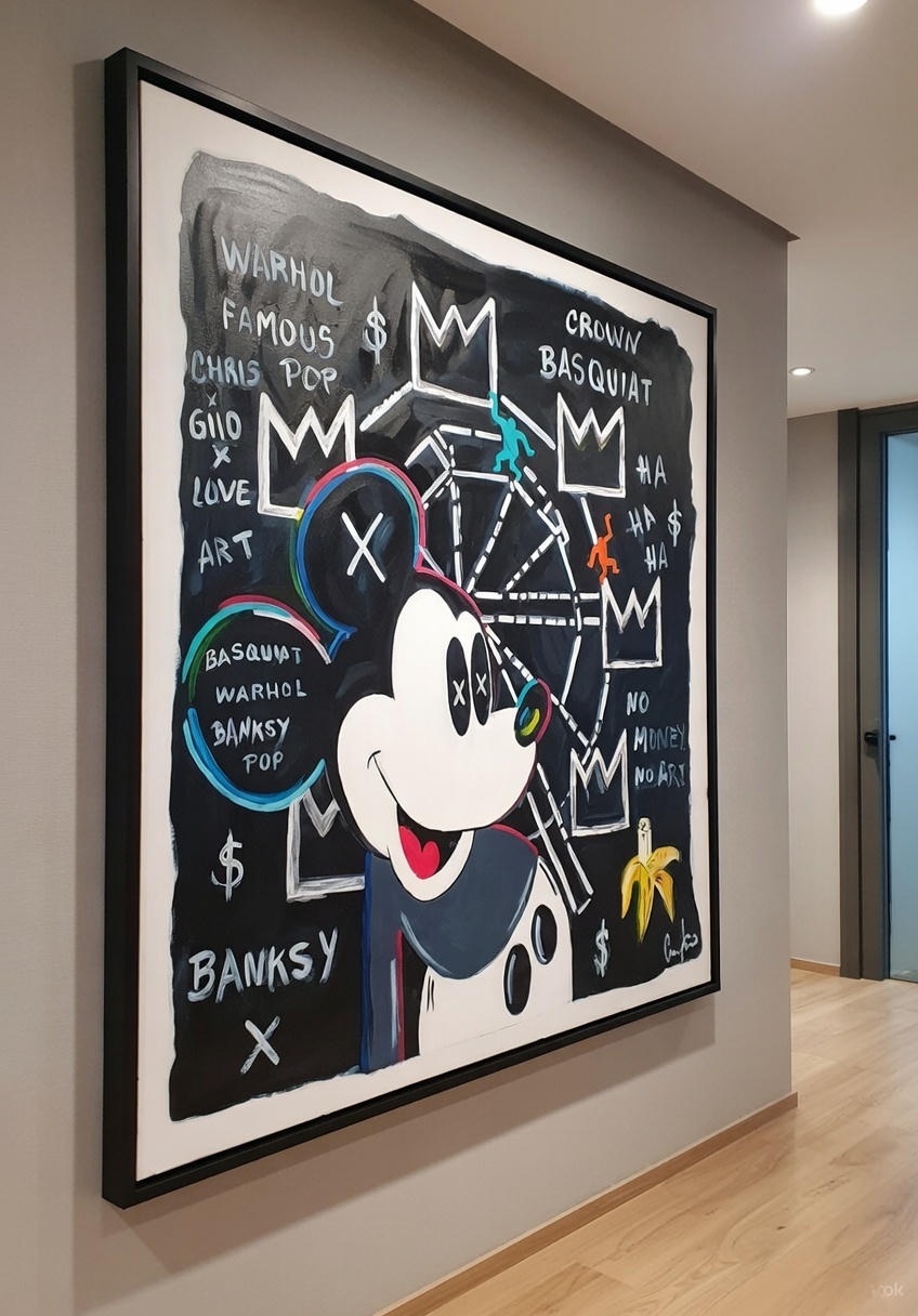 Ésta obra utiliza la figura de Mickey Mouse sonriente como eje central, junto a una noria llena de coronas y un fondo negro que evoca oscuridad. Desde pequeños, los parques temáticos y sus personajes nos enseñan a creer en un mundo mágico y perfecto, lleno de felicidad constante, siempre sonrientes y con música alegre, pero la vida real es mucho más caótica y desafiante.