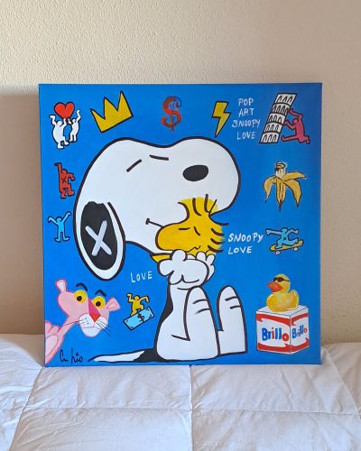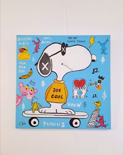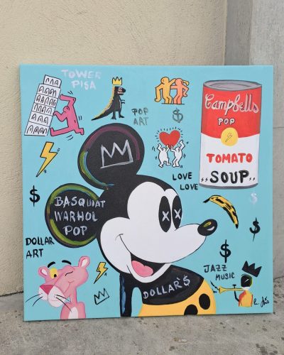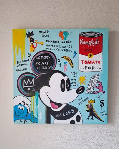 No pink, no panther. «Ni rosa, ni pantera.´´ La famosa «Pantera rosa´´ ese personaje de carácter educado, personalidad relajada, solitaria y muda que se comunica mediante gestos, caras y sonidos. Una obra de estilo Pop art en el que el fondo turquesa claro hace homenaje a la famosa obra de Marilyn Monroe de Andy Warhol, en este caso incluyendo diferentes elementos de la cultura pop